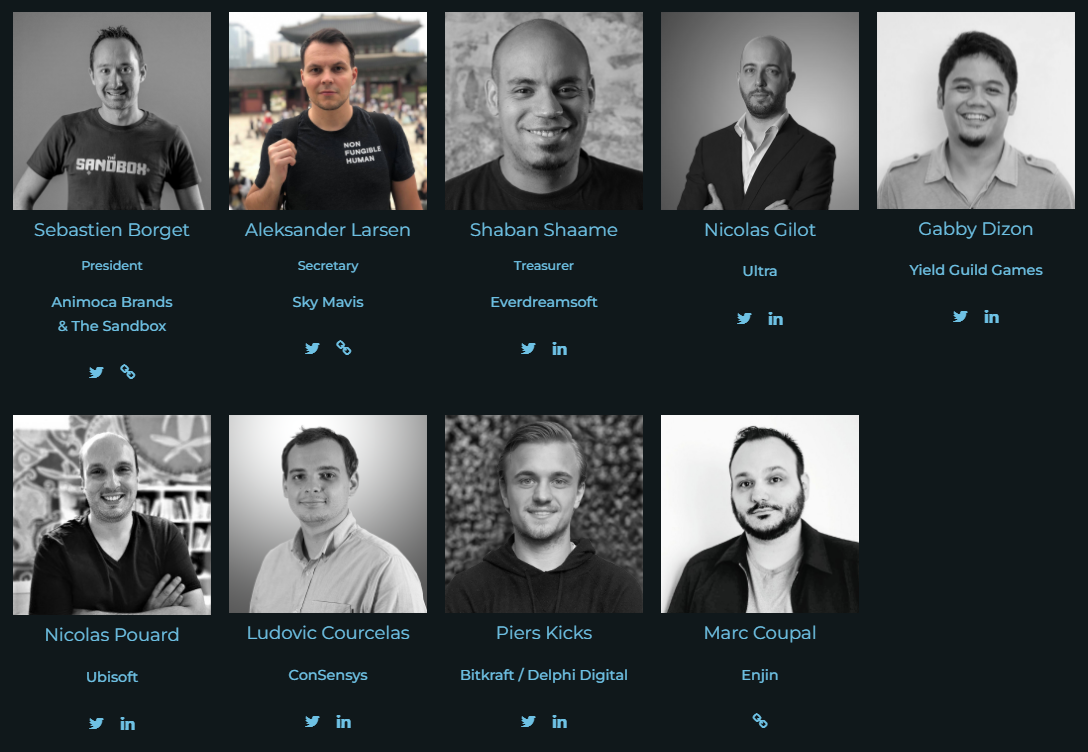 El presidente de BGA es Sebastien Borget, fundador de Animoca Brands y Sandbox. Los miembros destacados de la junta incluyen expertos de otros juegos y gremios importantes.
