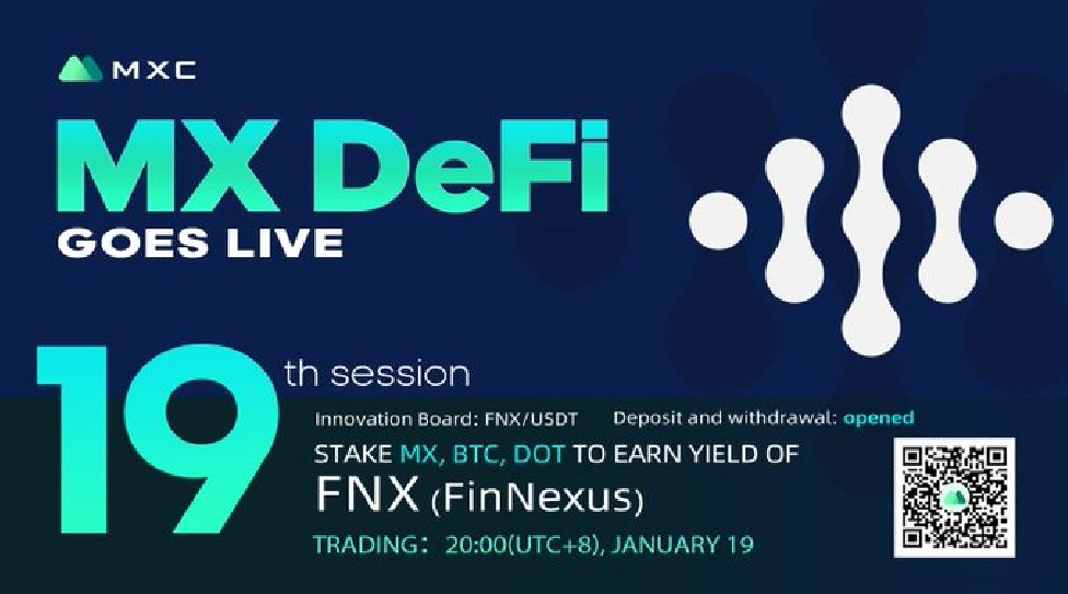 MXC incluirá a FinNexus (FNX) en el tablero de Innovación y abrirá operaciones para el par de operaciones FNX / USDT a las 20:00 (UTC + 8), el 19 de enero. Y MXC lanzará la 19ª sesión «MX DeFi» el 18 de enero. Los detalles son como sigue.