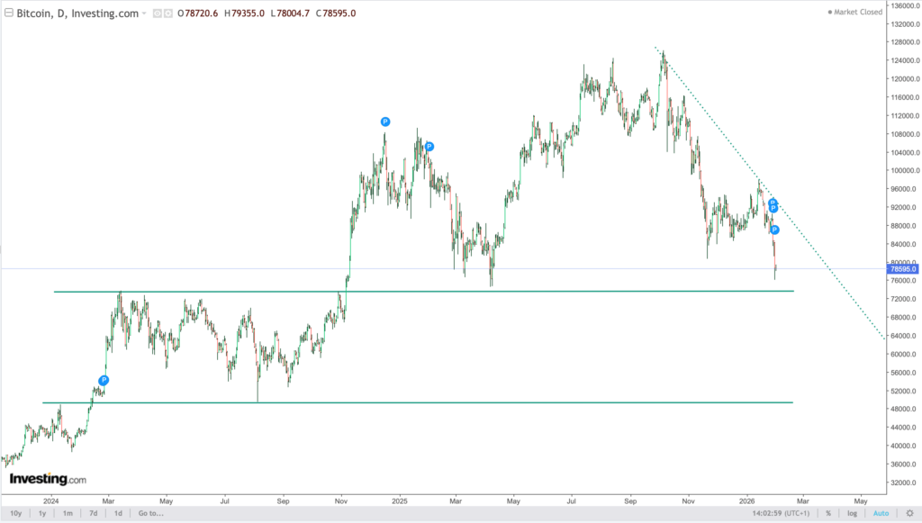 - Soporte intermedio actual: 75.000 USD, zona probable de test si la presión persiste.