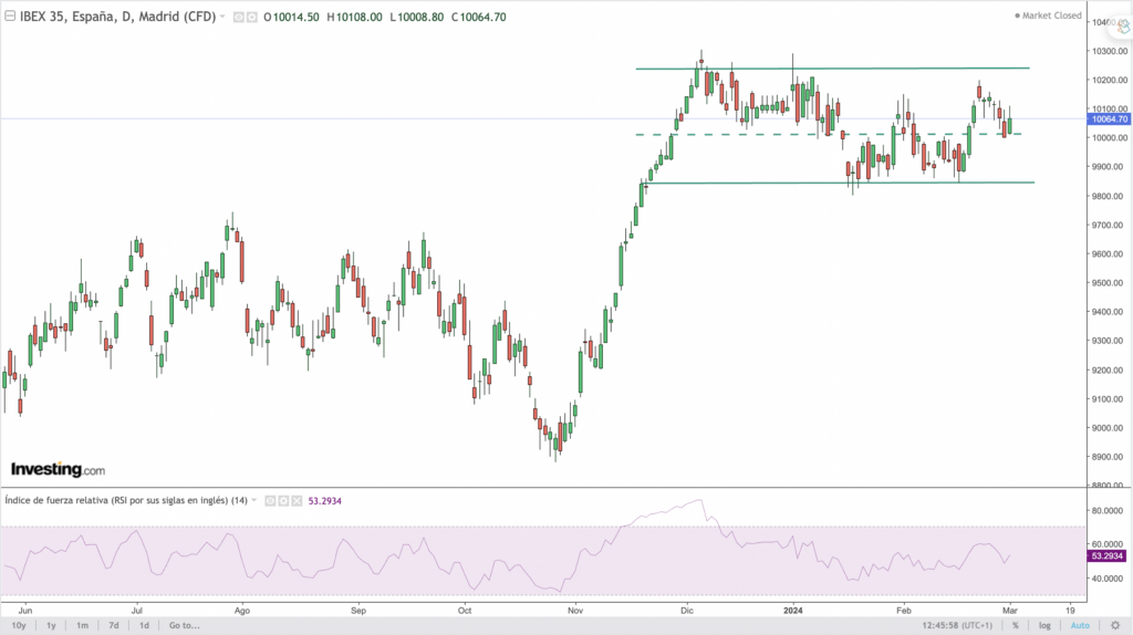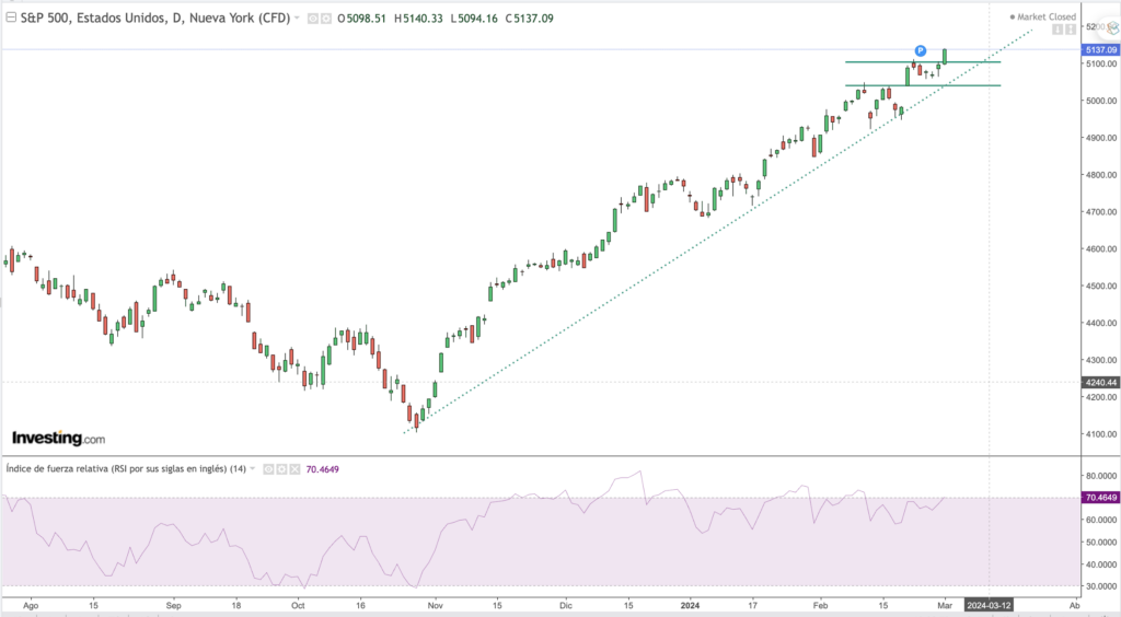 Desde un punto de vista técnico, el índice sigue marcando máximos históricos – son ya 15 el número de sesiones en 2024 donde se ha marcado un ATH – rompiendo al alza la zona de control que establecimos en los 5100 puntos. Este es ahora el primero de los soportes para vigilar en el corto plazo. Por debajo, tenemos que buscar referencias en los 5030, 5000 y en los 4925 puntos referencias de cierta importancia. Precaución en un entorno de sentimiento muy positivo, ventas de “insiders” y un VIX que empieza a presentar indicios de aumentos suaves.