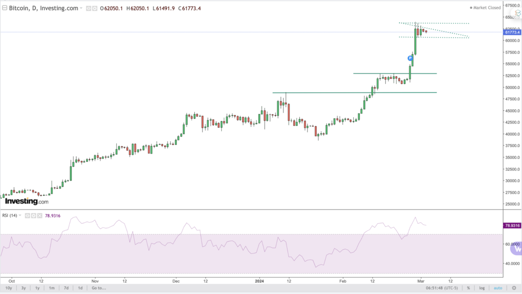 Desde un punto de vista técnico, ruptura de la zona de los 53.000USD e impulso hasta la referencia de los 63.000USD. La superación de los 59.000USD ha sido fulminante y muestra del estado de euforia actual. Tras ese impulso, los precios han pasado a un movimiento de consolidación, generando movimientos brutales en el resto de Altcoins. Son estos momentos de FOMO y de inicio de llegada de inversores retrasados, los que deben mantenernos alerta y extremar la gestión de riesgo. Perder los 60500USD nos abrirá la puerta a ir a buscar los 59.000USD que, de perderse, abren camino a un posible retroceso hasta los 53.000USD. Por arriba, superar los 63.000USD marcarán el camino hacía los máximos históricos. Sobrecompra, exceso de optimismo e inicio de entrada de flujos como catalizadores negativos.
