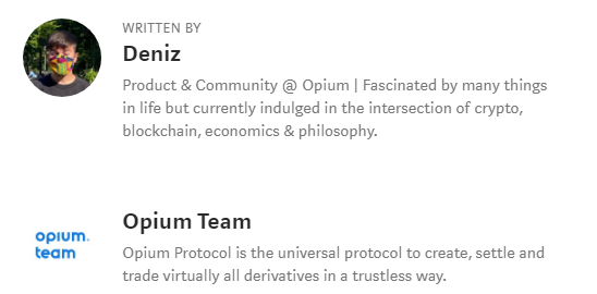 Deniz, Opium protocol.- La mayoría de los derivados que cotizan hoy en nuestro Exchange de Opium se centran en las Finanzas Descentralizadas (DEFI), sin embargo, el Protocolo de Opium también puede ser utilizado por empresas del sector financiero tradicional.
