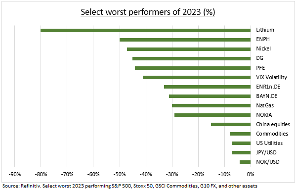 Yendo un paso más allá, nos fijamos en los valores con peores resultados del año pasado, en busca de oportunidades de rebote (véase el gráfico), como el yen, el VIX, las energías renovables y la sanidad.