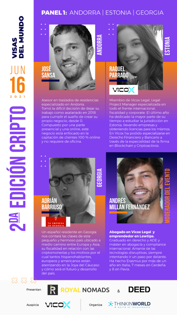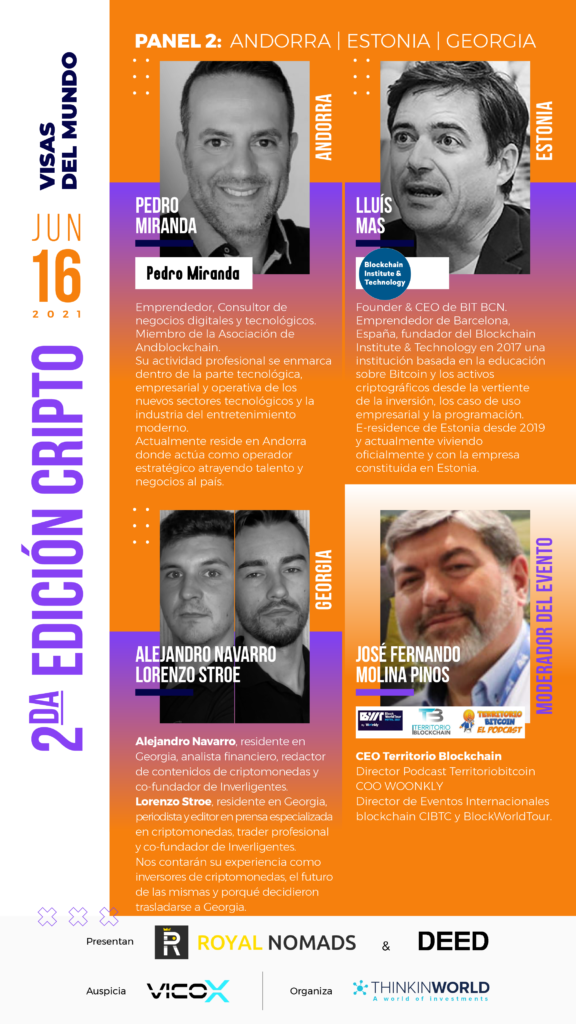 Panel en el que se pondrá de manifiesto, de mano de distintos expertos, las innumerables oportunidades que ofrecen los países de Andorra, Estonia y Georgia, tanto desde una perspectiva orientada a la residencia y lifestyle, como desde una óptica más enfocada al papel que juegan las criptomonedas en dichas naciones.
