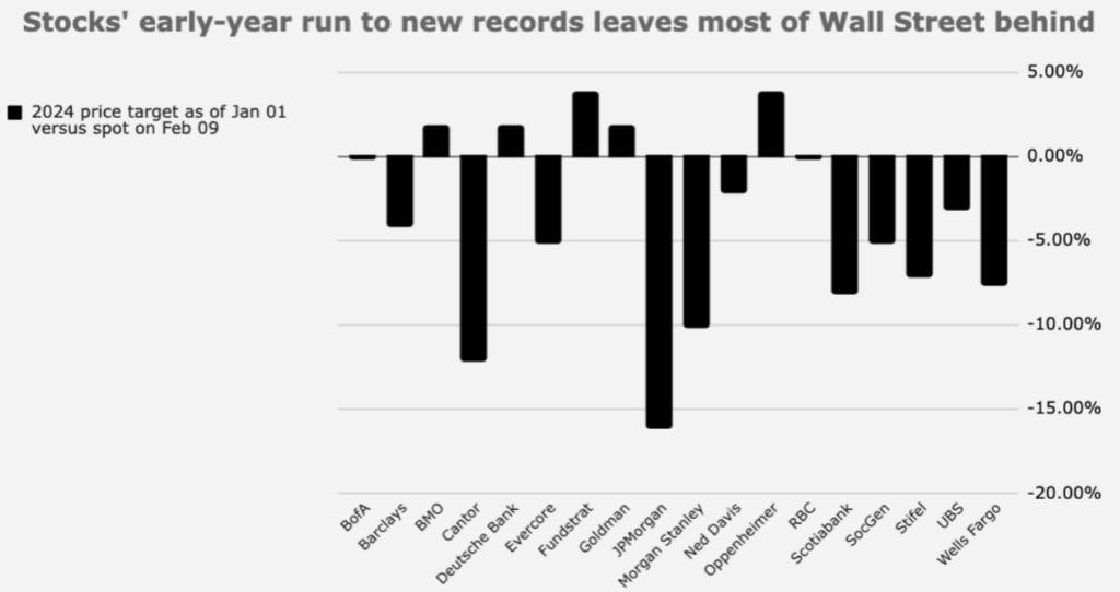 De las últimas 15 semanas de bolsa para el SP500, 14 han terminado en positivo. El VIX de volatilidad continúa en niveles muy bajos, mientras el sentimiento inversor ha pasado a zona de complacencia y en la semana, se han superado los 5000 puntos logrando un alza acumulada del 5,4% (YTD). El mercado de valores USA ha continuado subiendo a pesar del escepticismo y las preocupaciones de los analistas de Wall Street, lo que ha llevado a una disparidad entre los objetivos de los principales bancos de inversión y el SP500 como vemos en este gráfico. Una vez más, los que operan en base al sentimiento contrario vuelven a triunfar.