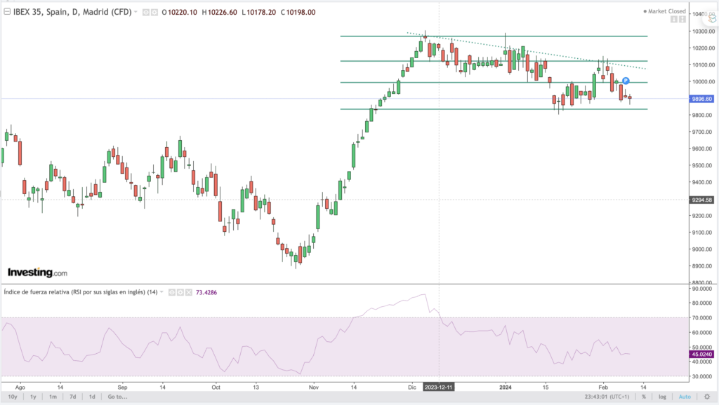 Desde un punto de vista técnico, seguimos en el movimiento de consilidación bajista, con primer soporte relevante en los 9.800 puntos. Por arriba son los 10.050 – 10.080 puntos los que funcionan como primera resistencia y en los 10250 tenemos la verdadera zona de control que deberá ser superada para pensar en algo mayor. De momento los 9800 puntos están siendo sometidos a presión que, en caso de ceder, llevará al Ibex-35 a los 9680 primero y al objetivo bajista que delimitan los 9500 puntos.