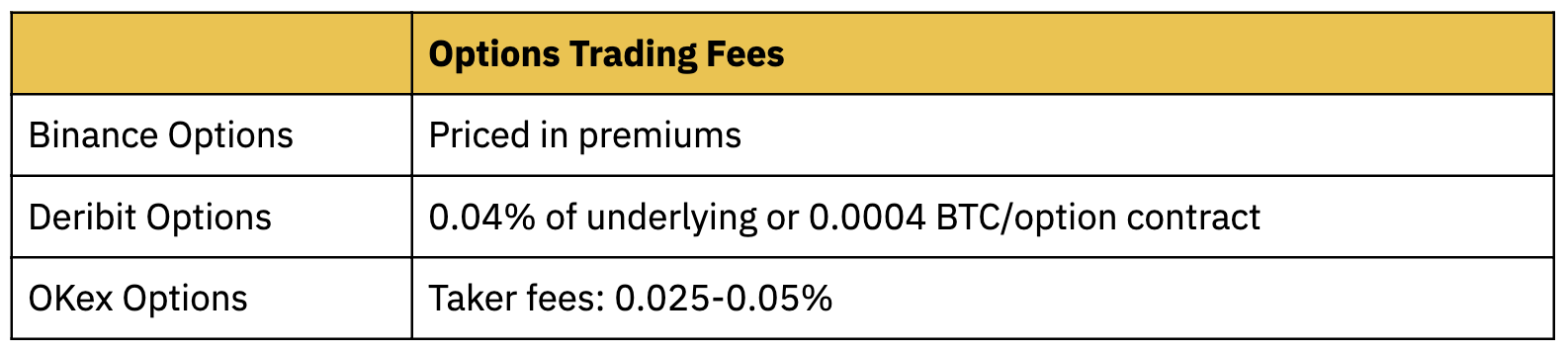 Por otro lado, los usuarios de Binance Options no necesitan incurrir en tarifas adicionales que no sean las primas pagadas por la opción. Mientras tanto, los usuarios de otras opciones de cifrado incurren en una tarifa comercial además de las primas pagadas.