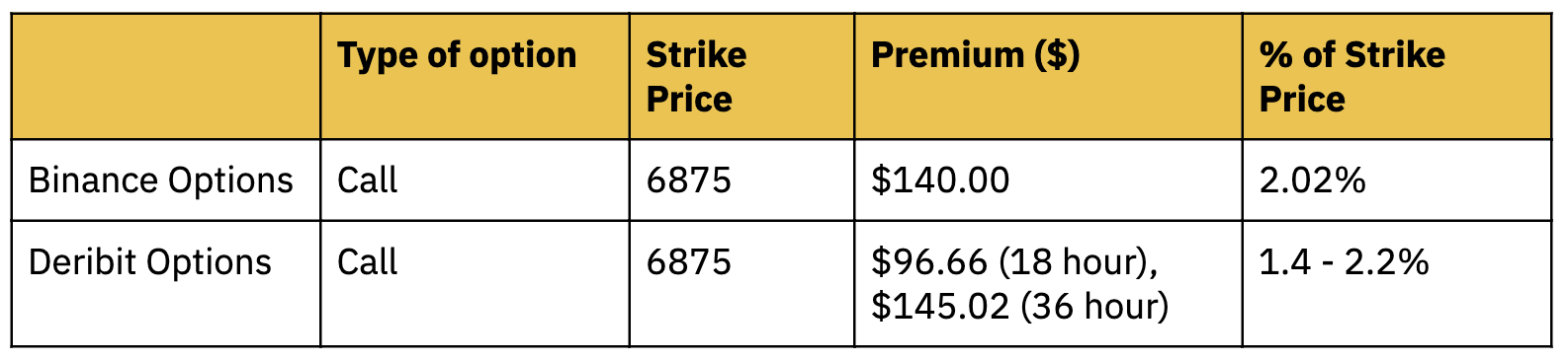 Para ilustrar la diferencia, consideremos un escenario en el que un comerciante quiere comprar opciones de BTC al precio actual de $ 6875.