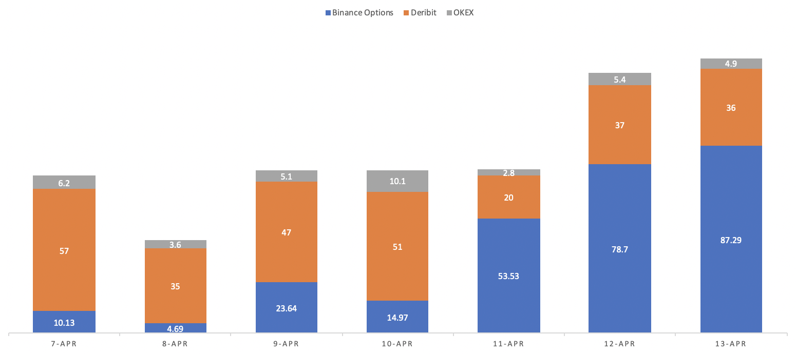 Volúmenes diarios de opciones de BTC en Binance, Deribit y OKex (en millones)