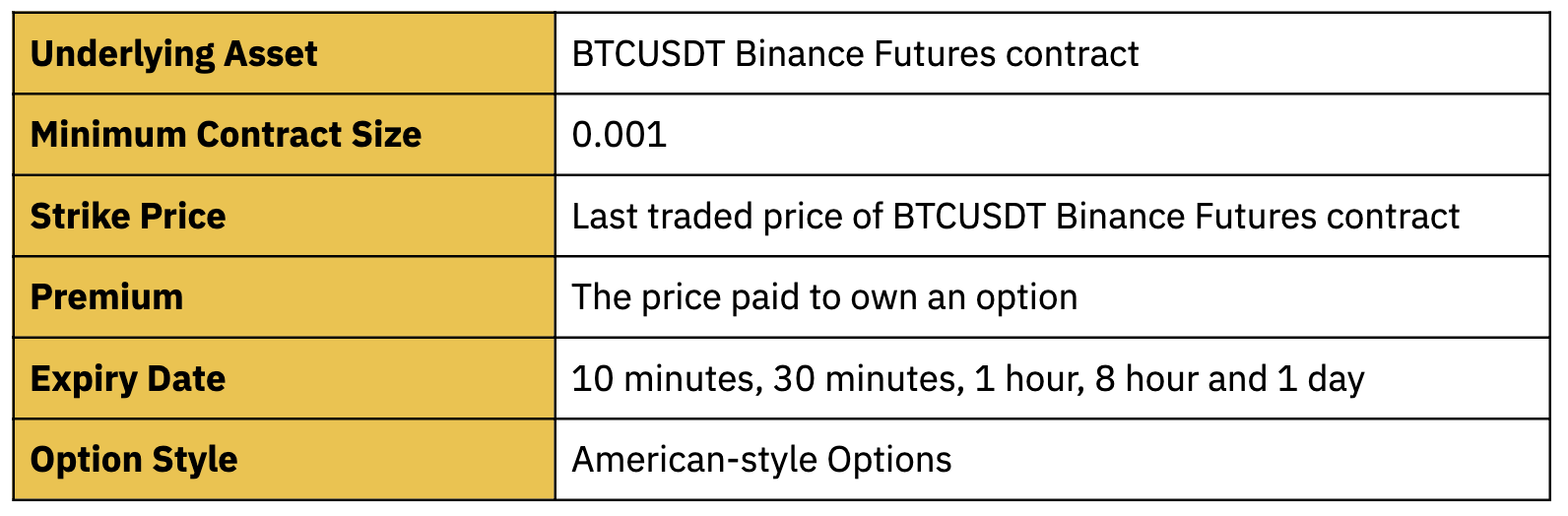 La Tabla 1 especifica las especificaciones del contrato de las Opciones de Binance.