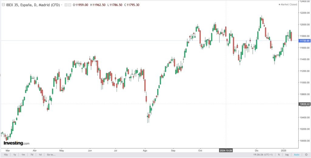 Desde un punto de vista técnico, el IBEX se mueve dentro de un canal entre 11,400 y 12,000 puntos, lo que subraya la consolidación actual y la indecisión del mercado. En caso de perder el soporte de 11,600 puntos iremos a la base del canal, en los 11,400 primero y los 11,300 puntos, donde se encuentra el siguiente soporte fuerte. Una ruptura de este nivel intensificaría la presión bajista. Superar los 11,800 podría abrir las puertas a los 12,000 puntos.
