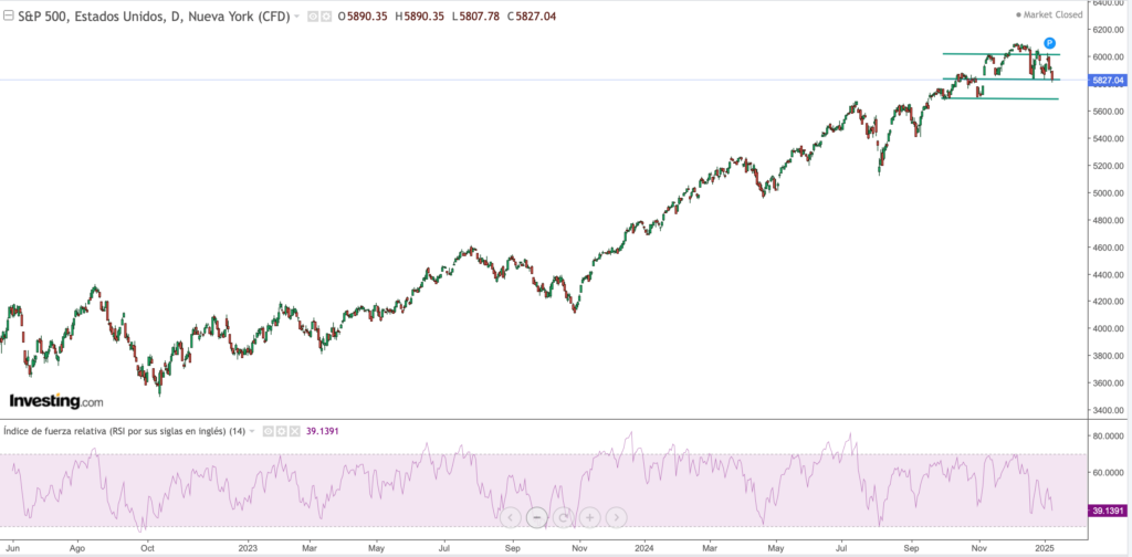 Desde un punto de vista técnico, si el SP500 logra mantenerse por encima de los 5,800 puntos, el índice podría intentar un nuevo avance hacia los 6,100 puntos. Una ruptura convincente de esta resistencia abriría las puertas a un posible movimiento hacia los 6,200 puntos e incluso nuevos máximos. Sin embargo, si el soporte de los 5,800 puntos no se mantiene, es probable que el índice caiga hacia los 5,600-5650 puntos, un nivel que será crucial para evitar una corrección mayor. La pérdida de esta zona podría intensificar las ventas y generar mayor presión bajista. Los niveles de sobreventa actuales invitan a pensar que, de momento y a espera de las noticias de la semana, podemos asistir a cierto rebote.