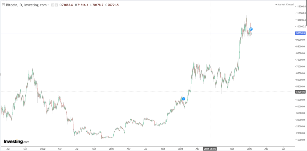 Desde un punto de vista técnico, bitcoin se encuentra en un punto clave de su evolución, consolidándose en niveles cercanos a los 95,000 dólares tras un impresionante rally que lo llevó a superar resistencias importantes en los últimos meses. Esta pausa técnica no es más que el reflejo de un mercado que toma un respiro después de fuertes subidas, pero que también deja entrever la incertidumbre sobre cuál será el próximo movimiento del activo digital más relevante del mundo.