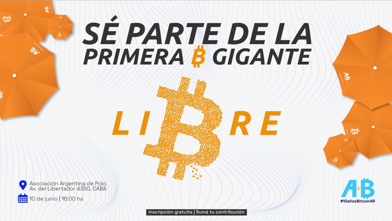 En ocasión de la celebración de sus diez años, la ONG Bitcoin Argentina convocará el próximo 10 de junio a millares de personas en el Campo Argentino de Polo de la Ciudad Autónoma de Buenos Aires para armar una “₿” humana gigante que podrá verse desde el cielo. El objetivo de la convocatoria es visibilizar y concientizar sobre los valores de Bitcoin y blockchain, como la libertad monetaria y financiera, la privacidad, la transparencia y la descentralización.