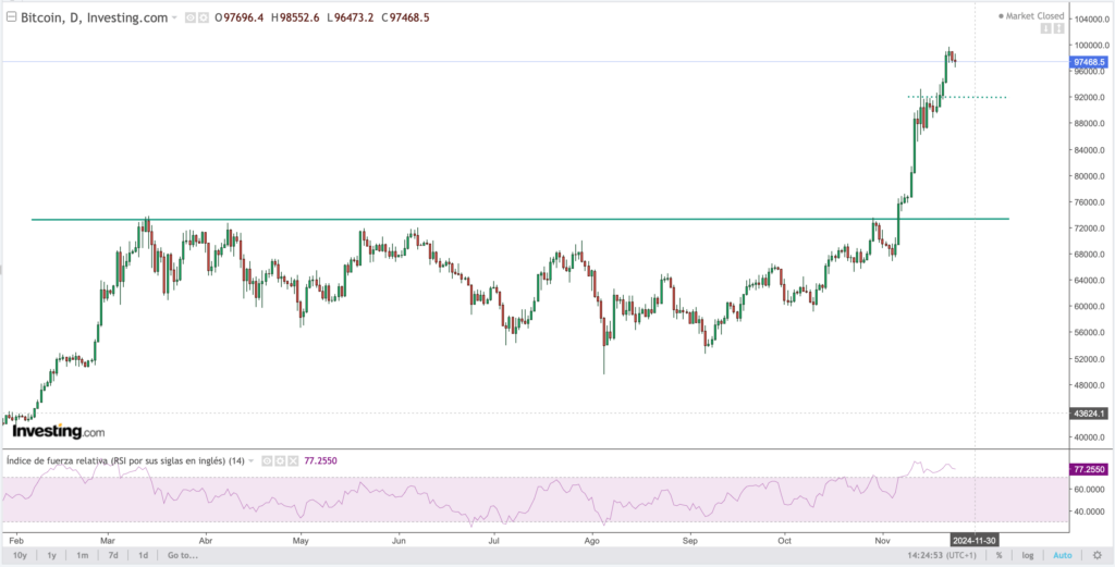 Desde un punto de vista técnico, tras superar los 93000USD entramos en zona de descubrimiento de precios y la cota de los 100.000USD ha quedado a menos de 1000USD de tocarse. Sigue entrando dinero de forma importante en cripto, vemos la típica entrada de otros ciclos hacía las Altcoins, destacando aquellas más “antiguas” en claro síntoma de regreso de ciertos especuladores que no atienden a argumento de valor alguno y actualmente no tenemos soportes de relevancia hasta la zona de los 73000USD. Esto supone que, realmente, bitcoin puede corregir hasta esa referencia y seguir siendo alcista. Por poner algún valor menor, los mínimos marcados en los 85000USD son una referencia que podría funcionar a corto plazo. Por arriba, superar los 99000USD volvería a colocar al BTC en zona de descubrimiento de precios.