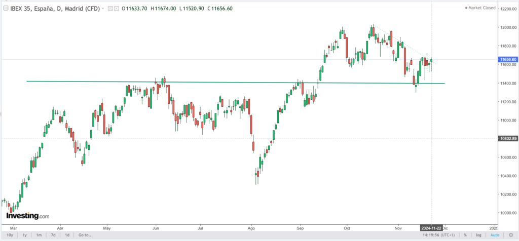 Desde un punto de vista técnico y tras el rebote experimentado desde la primera zona de control marcada por los 11400 puntos, los precios están luchando por superar los 11600 puntos. Necesitamos confirmación por encima de este nivel para intentar ir a por los 11800 y los 12000 puntos. Si los precios no pueden con los 11600, directos a los 11400 de nuevo. Por abajo quedarán los 11200 puntos y los 10800.
