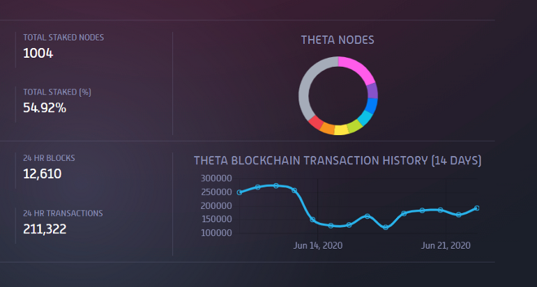 En total, casi el 55% del suministro circulante de CMC de THETA está en Stake, totalizando 478m + THETA. De acuerdo con Staking Rewards , eso pondría a Theta en el cuadro superior por el porcentaje de participación de todos los protocolos de Proof of stake, ¡no está mal durante los primeros 20 días de apuesta!