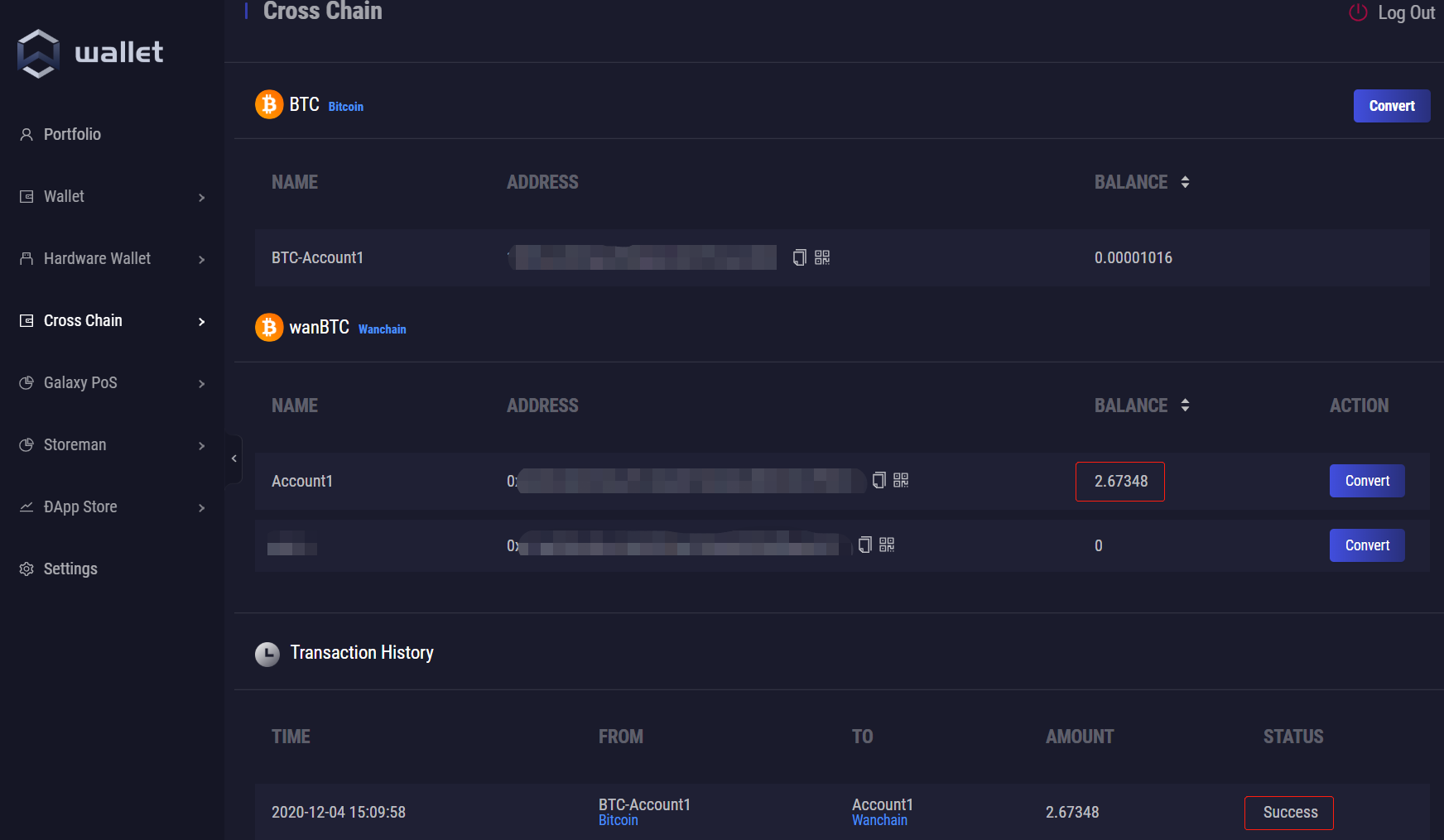 Después de los seis bloques confirmados en la red Bitcoin, recibirá wanBTC en su dirección de WanWallet. El estado de la transacción final estará Success